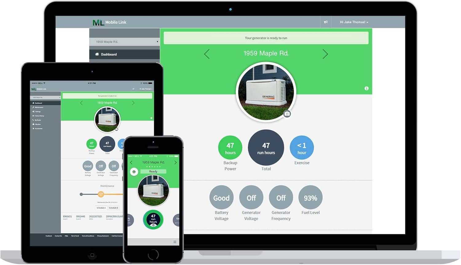 Mobile Link™ Remote Monitoring is included at no extra charge, allowing you to remotely monitor the generator’s status from anywhere in the world using your smartphone, tablet, or PC. You can easily access real-time data, such as operating status and maintenance alerts, and connect your account to an authorized service dealer for proactive service.